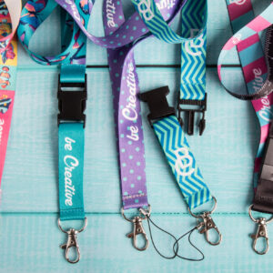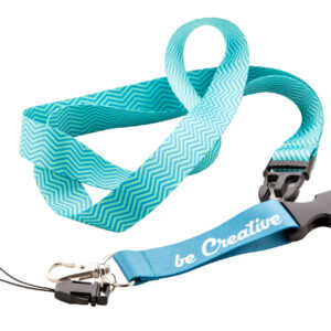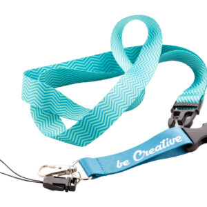 Custom made, polyester lanyard with detachable metal carabiner and mobile string. With sublimation printed graphics on both sides. MOQ: 100 pcs.
