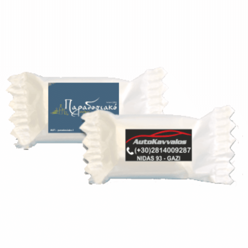 - Κάθε καραμέλα είναι συσκευασμένη σε λευκό περιτύλιγμα πάνω στο οποίο πραγματοποιείται η εκτύπωση.