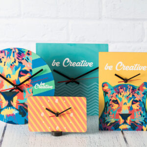 Custom made, square shaped HDF wood wall clock with custom graphic. Operates with 1 AA battery, without battery. MOQ: 50 pcs.